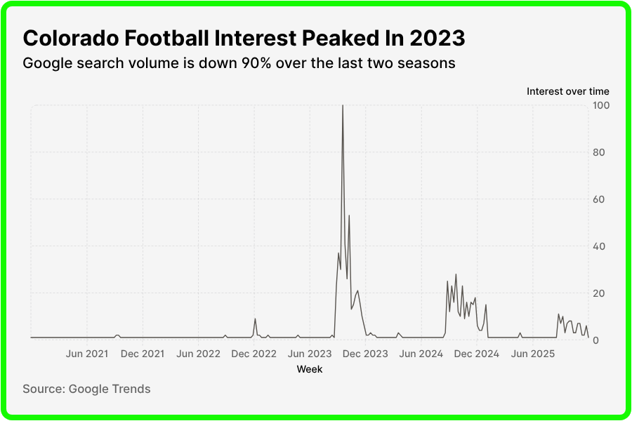 Needless to say, this is a disastrous situation for Colorado. Shedeur Sanders and Travis Hunter left town for the NFL, with ESPN’s College GameDay and Fox’s Big Noon Kickoff disappearing from Boulder with them. Fan attendance fell off a cliff as the team’s losses started to pile up this year, and search interest on Google Trends for Colorado’s football team has now fallen over 90% from Deion’s first season in 2023.