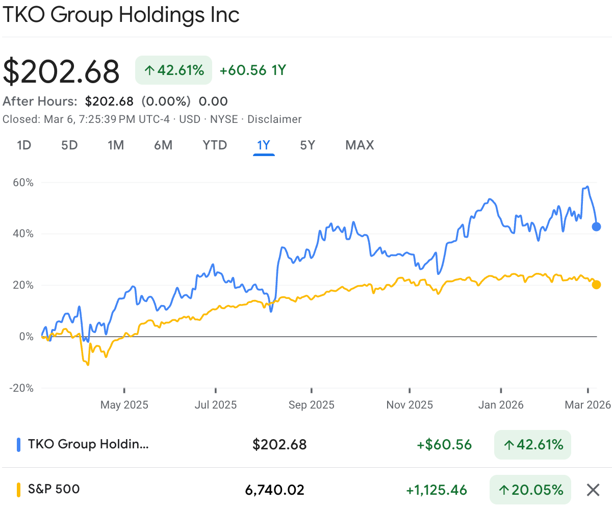 As a result, TKO’s publicly traded stock hit an all-time high last week and is now up 42% over the last 12 months, more than double the S&P 500’s 20% return.